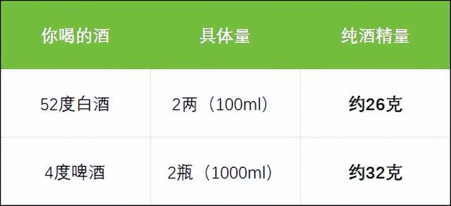换算一下:52度白酒不超过2两,或4度啤酒不超过2瓶。记住这是上限,不是推荐量。