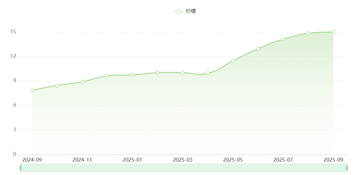 记者从全国农产品批发市场价格系统查询看到,最近一年,柠檬整体价格(单一品种的全国平均价)涨幅较大,从去年9月的7.83元/公斤上涨至今年9月的15元/公斤。